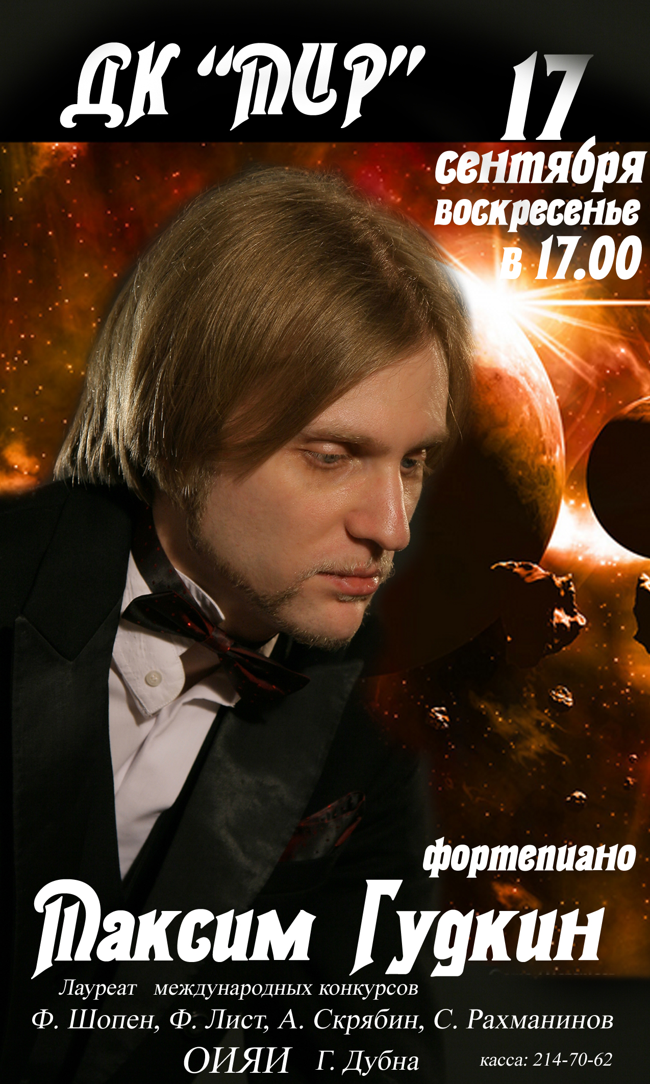Дом культуры «Мир» ОИЯИ приглашает 17 сентября 2017 г. в 17.00 часов на Концерт фортепианной музыки в исполнении лауреата международных конкурсов Максима Гудкина. В программе произведения Ф. Шопена, Ф. Листа, А. Скрябина, С. Рахманинова.