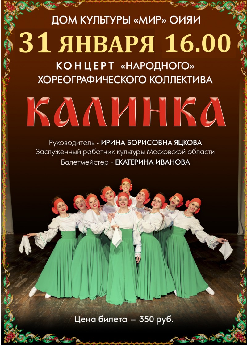 7 марта 2021 г. в 16:00 Дом культуры «Мир» ОИЯИ приглашает на концерт народного хореографиечского коллектива «Калинка».