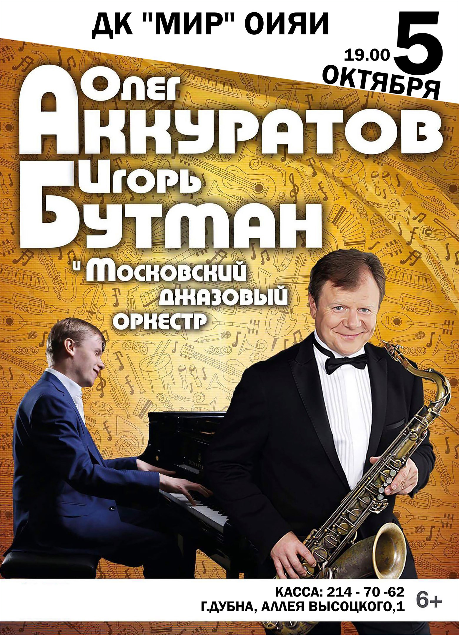 Дом культуры «Мир» ОИЯИ приглашает 5 октября 2017 г. в 19.00 часов на Концерт Игоря Бутмана и Московского джазового оркестра. Специальный гость — Олег Аккуратов. 6+