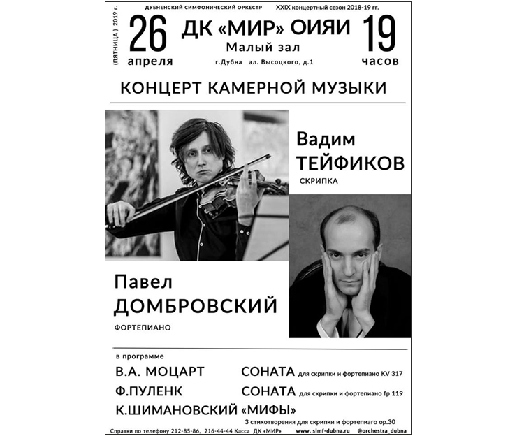 Исполнители — лауреаты международных конкурсов Вадим Тейфиков (скрипка), Павел Домбровский (фортепиано).