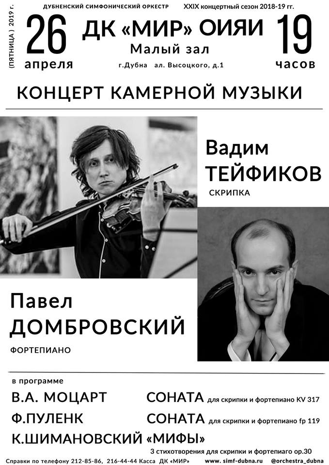 Исполнители — лауреаты международных конкурсов Вадим Тейфиков (скрипка), Павел Домбровский (фортепиано).