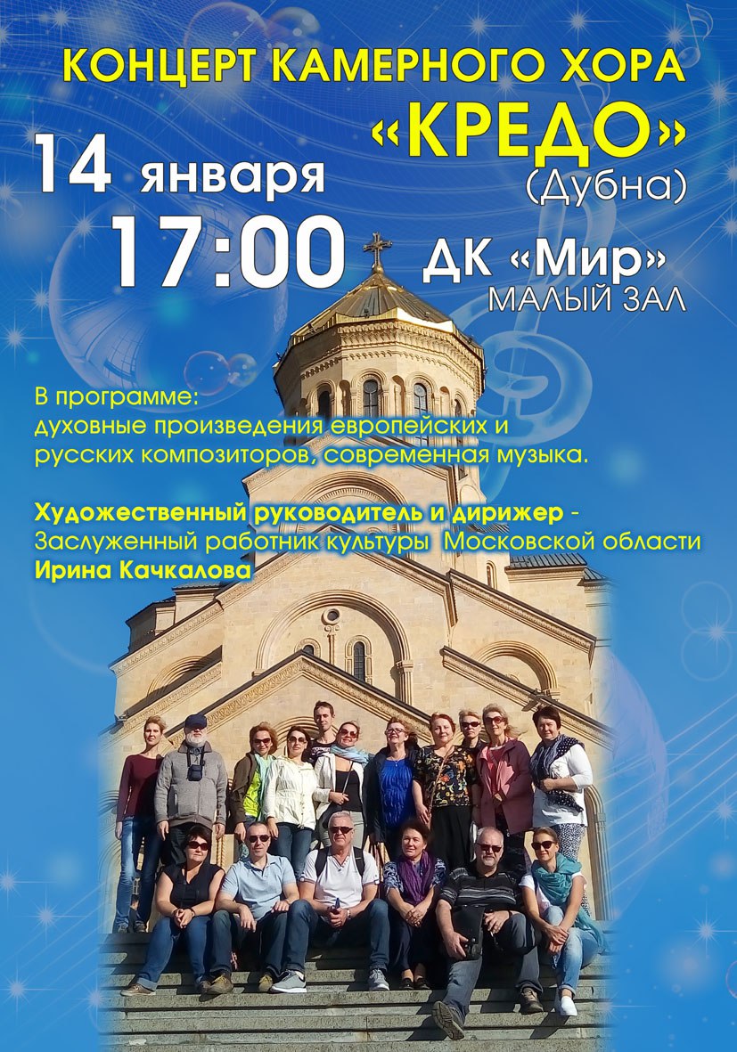 Дом культуры «Мир» ОИЯИ приглашает 14 января 2018 г. в 17.00 часов на концерт камерного хора «Кредо» ДК «МИР» ОИЯИ .