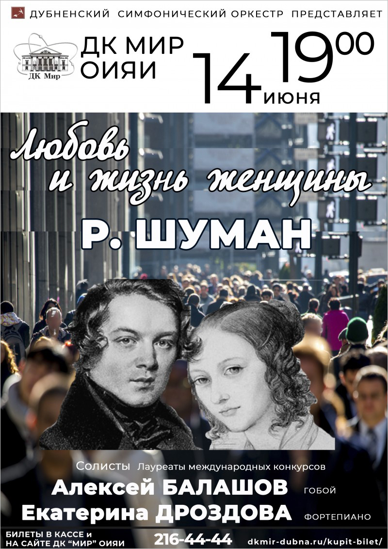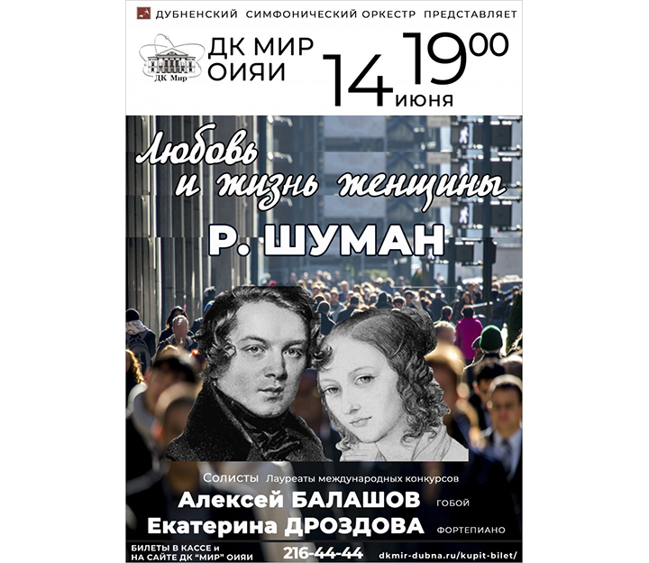 14 июня в 19:00 в Доме культуры «Мир» ОИЯИ состоится концерт камерной и фортепианной музыки композитора Роберта Шумана «Любовь и жизнь женщины».