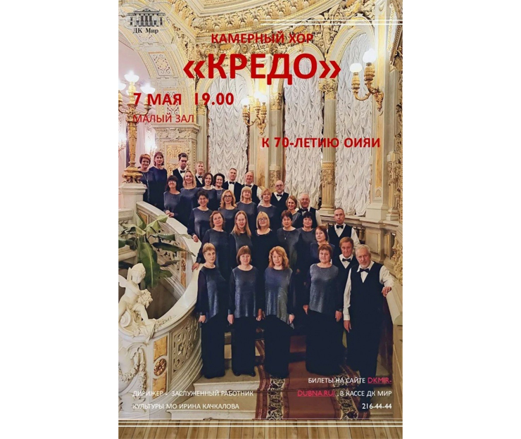 7 мая 2026 г. в 19:00 Доме культуры «Мир» ОИЯИ состоится отчетный концерт камерного хора ДК МИР «Кредо» к 70-летию ОИЯИ. Дирижер – заслуженный работник культуры Московской области Ирина Качкалова.