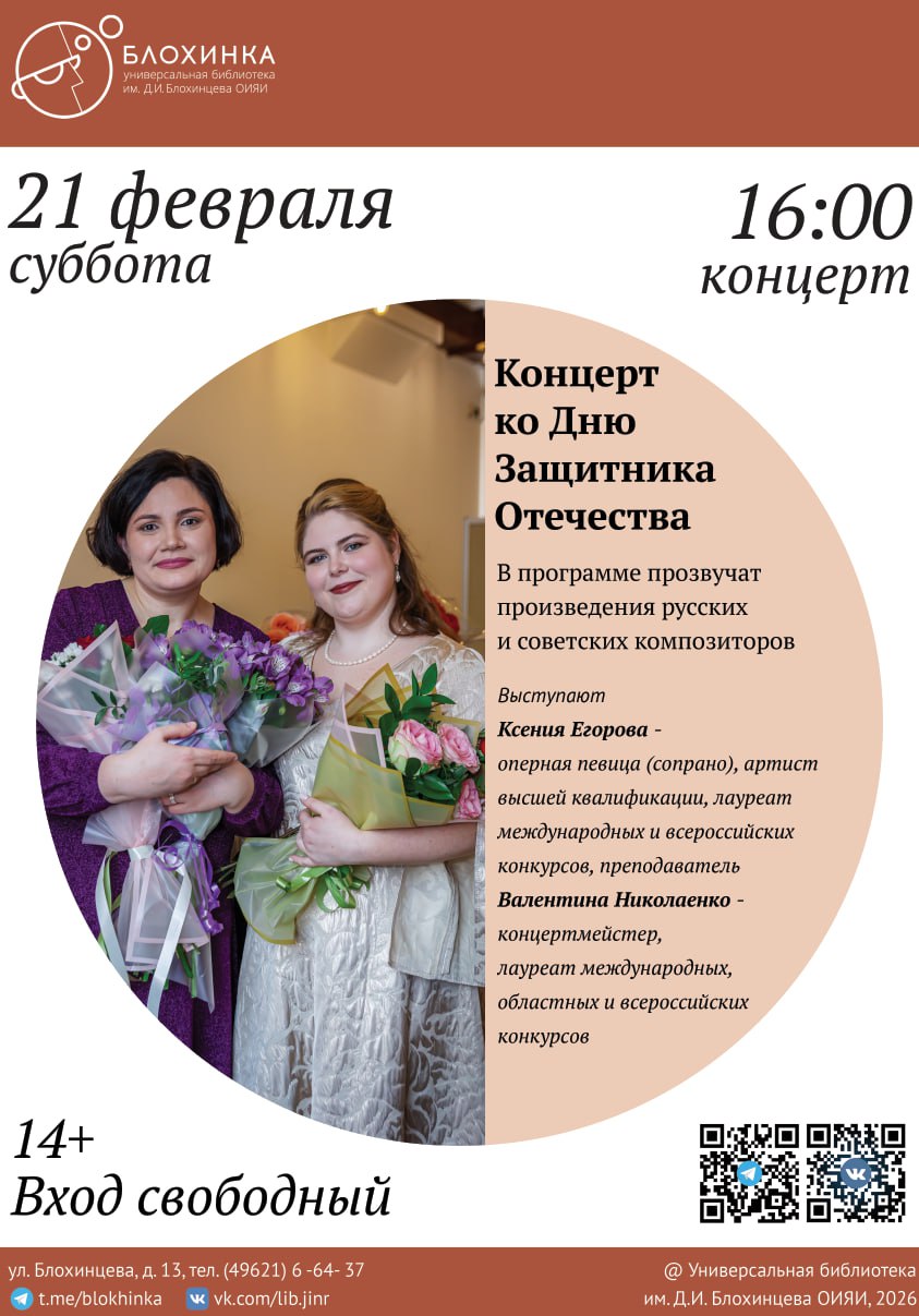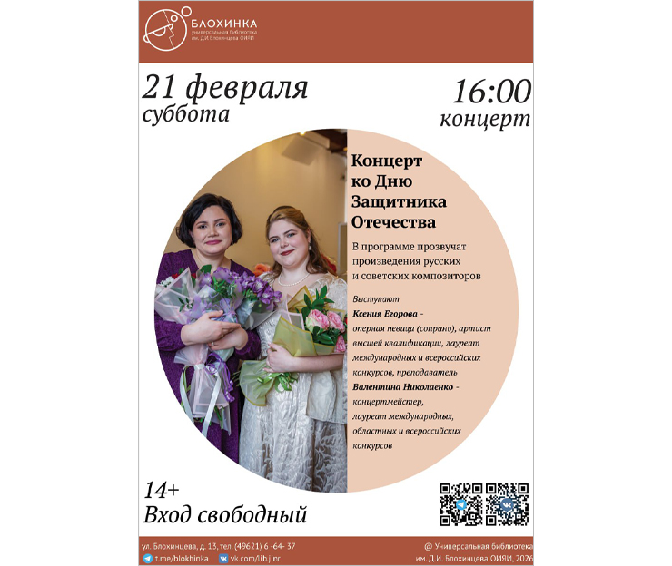 Универсальная библиотека ОИЯИ приглашает посетителей старше 14 на концерт ко Дню Защитника Отечества.