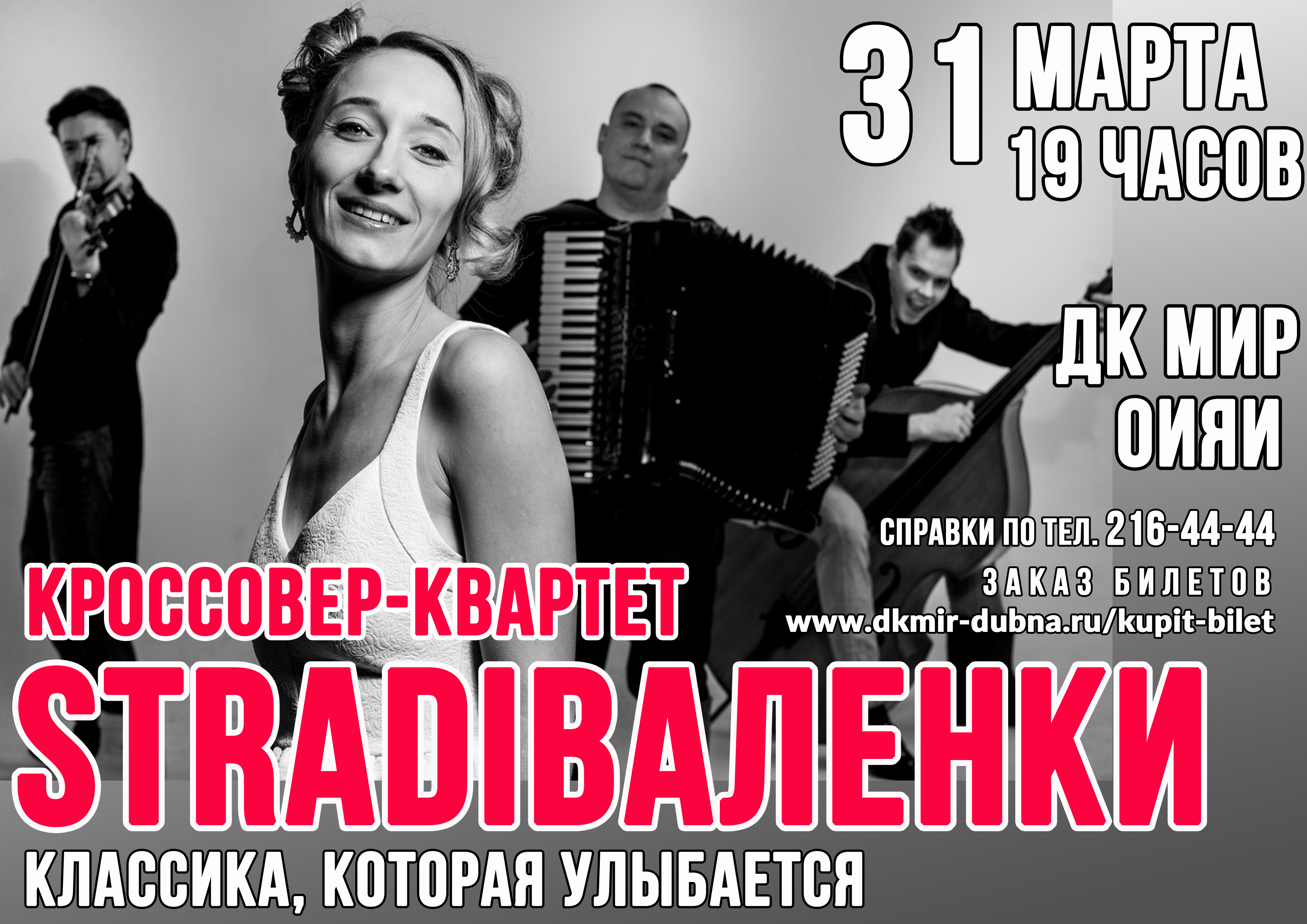 31 марта 2021 г. Дом культуры «Мир» ОИЯИ приглашает на концерт «Классика, которая улыбается!» в исполнении кроссовер-квартета «StradiВаленки».