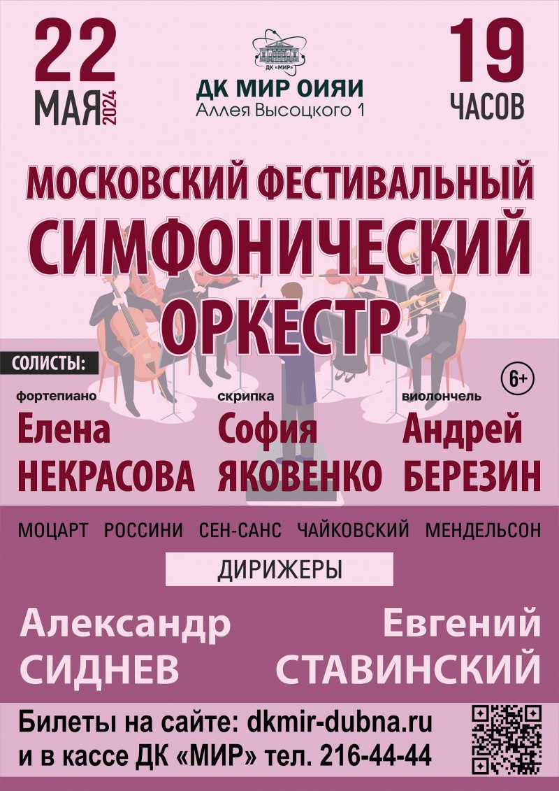 22 мая 2024 г. в 19:00 Дом культуры «Мир» ОИЯИ приглашает на концерт Московского фестивального симфонического оркестра.