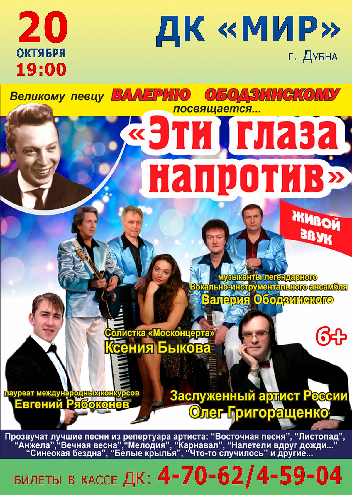 Дом культуры «Мир» ОИЯИ приглашает 20 октября 2017 г. в 19.00 часов на Концерт «Эти глаза напротив». Великому певцу Валерию Ободзинскому посвящается… Живой звук. 6+ .