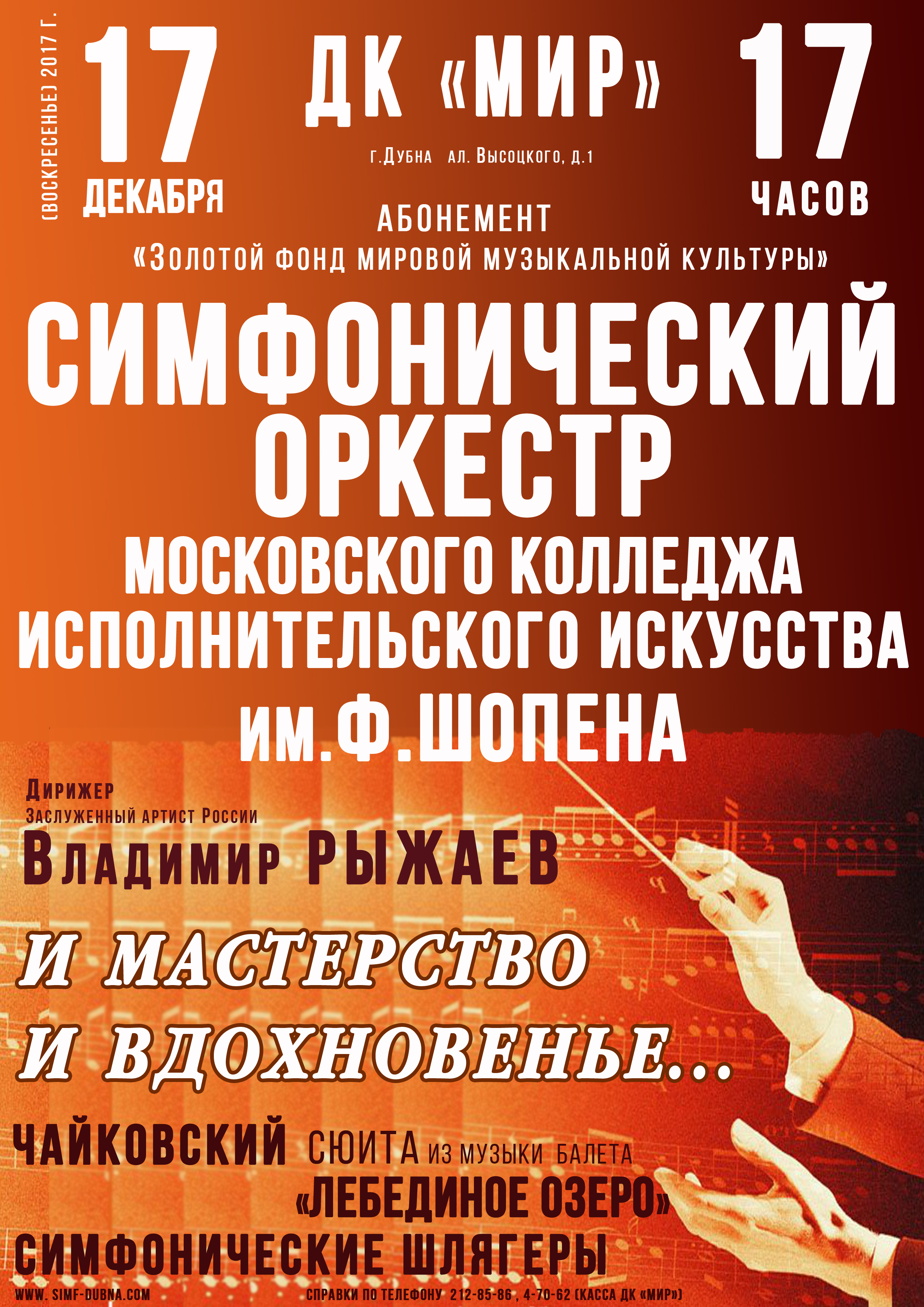 17 декабря 2017 г. в 17.00 часов Дом культуры «Мир» ОИЯИ приглашает на концерт «И мастерство, и вдохновенье…, подготовленный Симфоническим оркестром Московского государственного колледжа исполнительского искусства им. Шопена. Дирижер – Заслуженный артист России В. Рыжаев. Прозвучит сюита из музыки балета «Лебединое озеро» П.И.Чайковского, симфонические шлягеры.