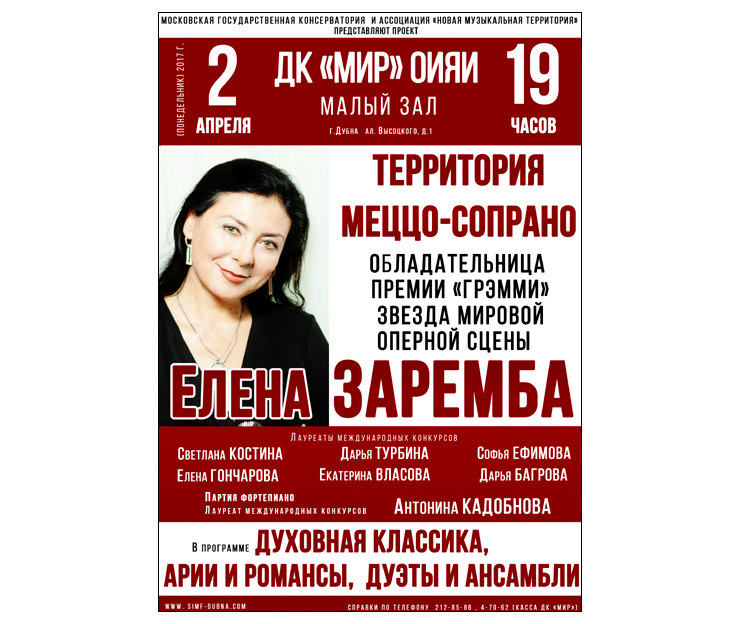 Дом культуры «Мир» ОИЯИ приглашает в понедельник, 2 апреля 2018 г., в 19:00 часов на концерт «Территория меццо-сопрано», подготовленный Дубненским симфоническим оркестром.