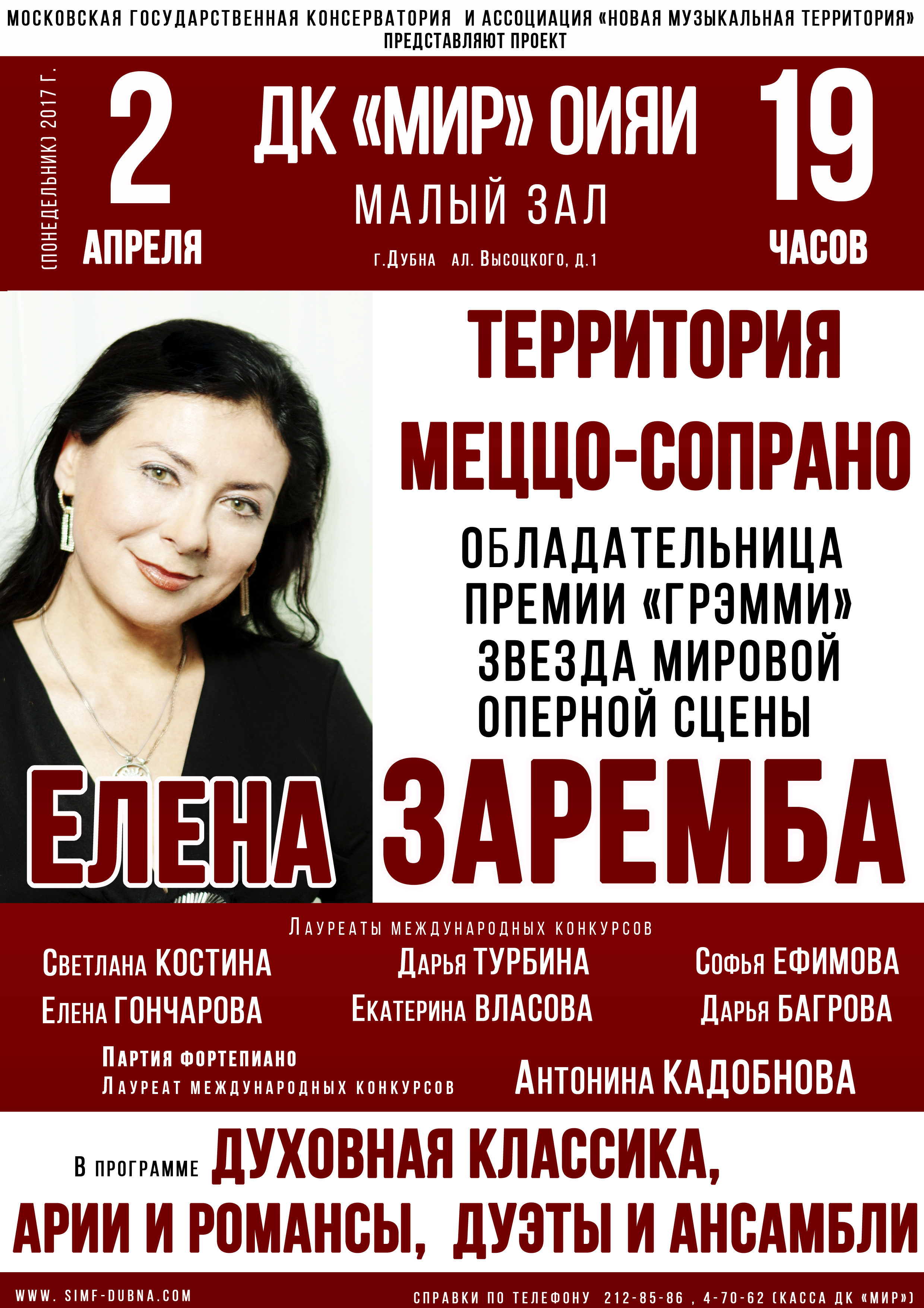 Дом культуры «Мир» ОИЯИ приглашает в понедельник, 2 апреля 2018 г., в 19:00 часов на концерт «Территория меццо-сопрано», подготовленный Дубненским симфоническим оркестром.
