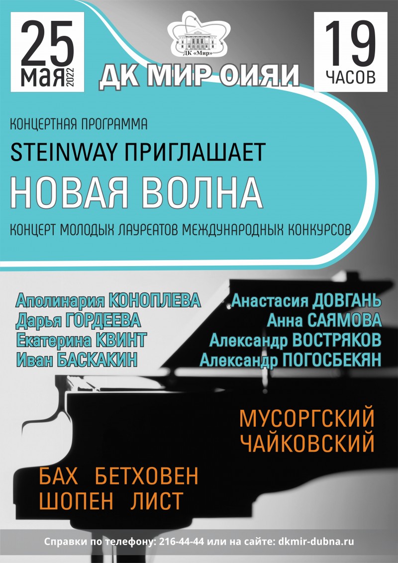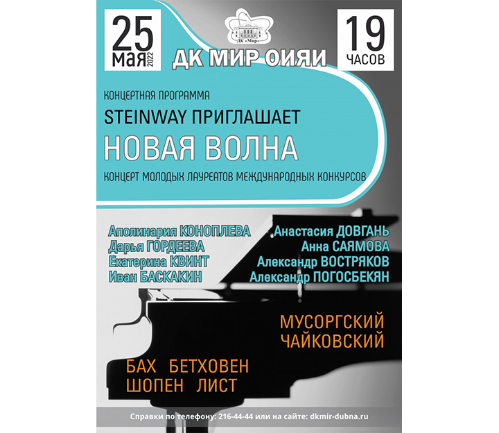 25 мая в 19:00 в Доме культуры «Мир» ОИЯИ состоится концерт молодых лауреатов международных конкурсов «Новая волна».