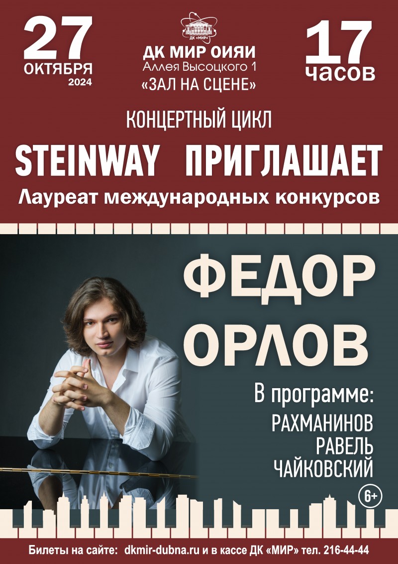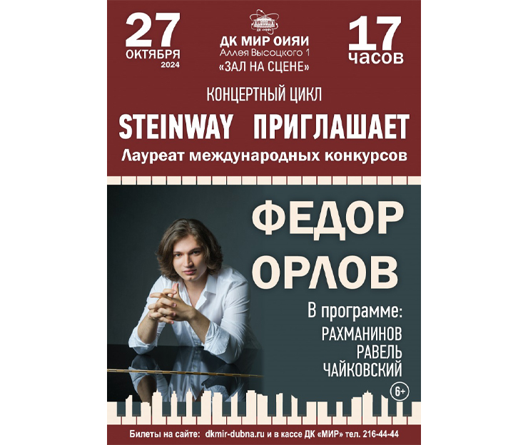 27 октября 2024 г. в 17:00 в ДК «Мир» ОИЯИ состоится концерт фортепианной музыки цикла «Steinway приглашает» в исполнении Федора Орлова. В программе вечера — музыка Чайковского, Рахманинова, Равеля.