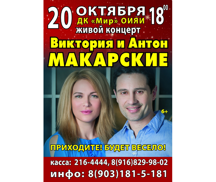 20 октября 2019 года в 18:00 часов, в Доме культуры «Мир» ОИЯИ состоится концерт Виктории и Антона Макарских.