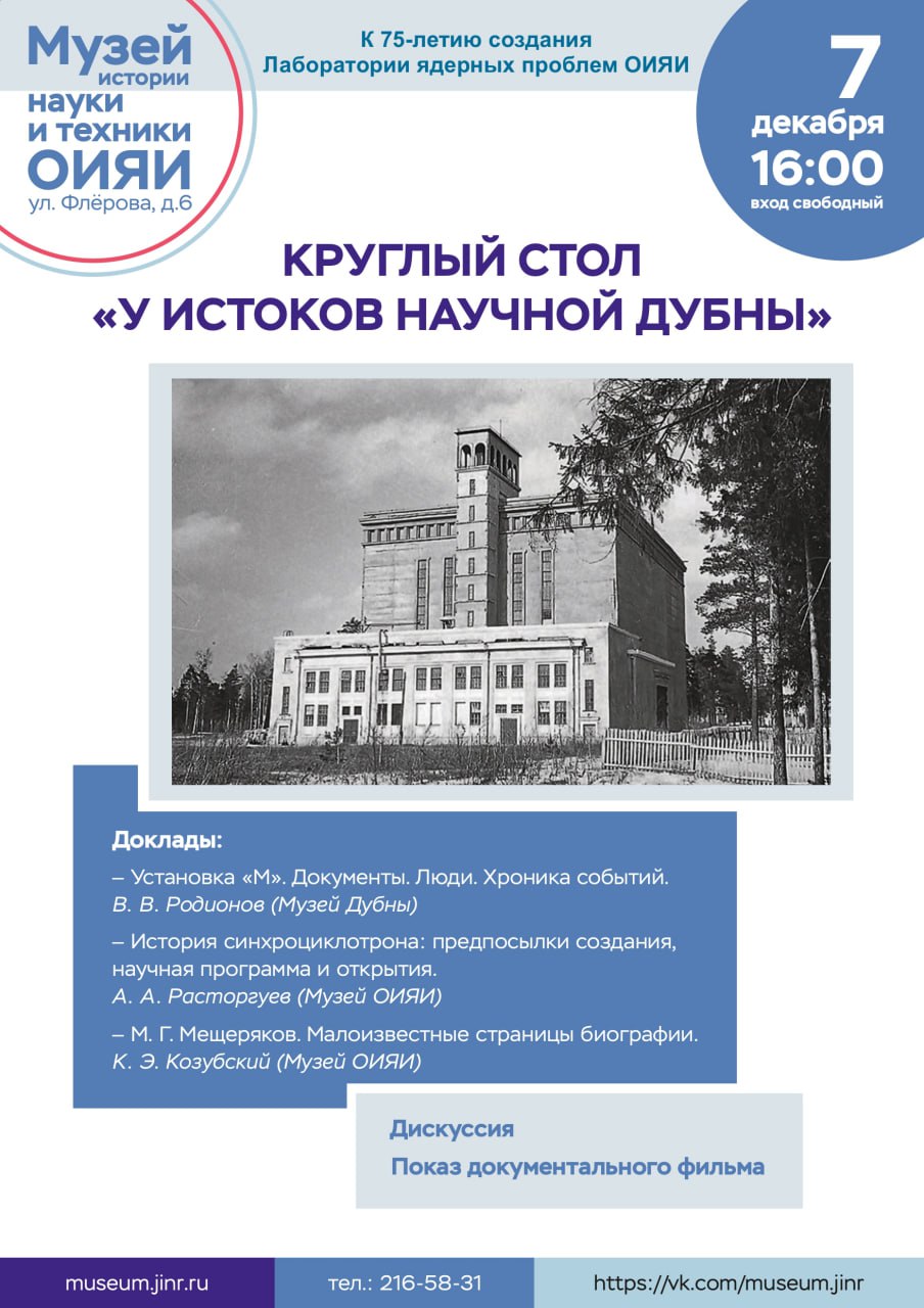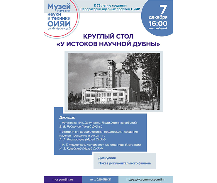 7 декабря в Музее истории науки и техники ОИЯИ пройдет круглый стол «У истоков научной Дубны». Мероприятие посвящено 75-летию создания Лаборатории ядерных проблем ОИЯИ.
