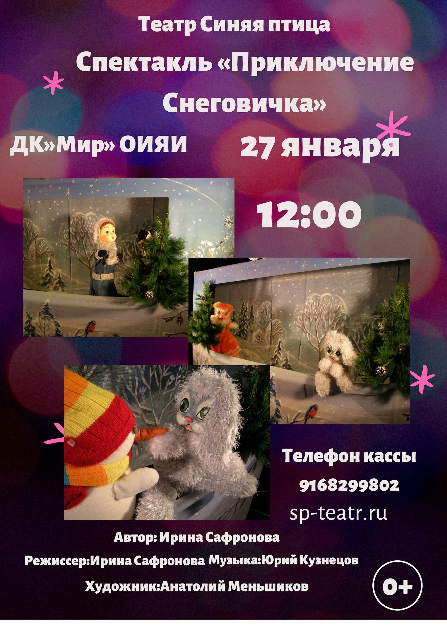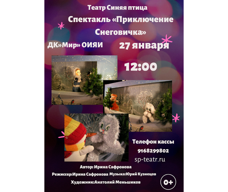 27 января 2019 года, в 12:00 часов Дом культуры «Мир» ОИЯИ приглашает на спектакль «Приключение снеговичка» в постановке театра кукол «Синяя птица». Спектакль пройдет в малом зале ДК.