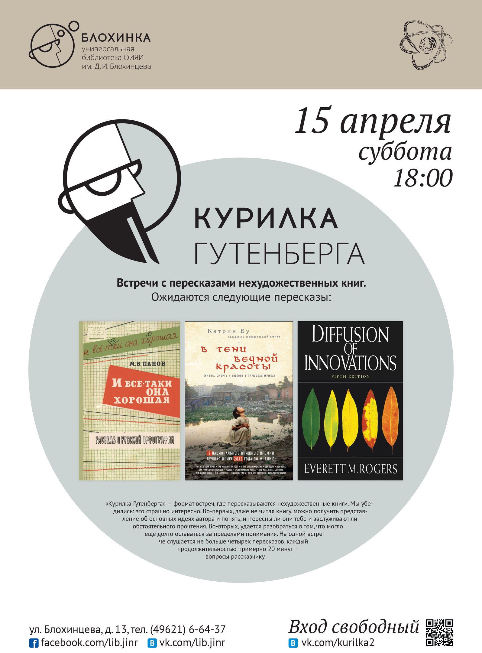 «Курилка Гутенберга» – формат встреч для широкой аудитории, где пересказываются нехудожественные книги: документальные или научно-популярные из любых областей знания (кроме религии, эзотерики и политики). После каждого пересказа – вопросы, реплики, комментарии.