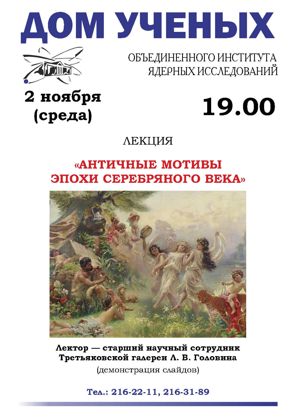 Дом ученых ОИЯИ приглашает на лекцию «Античные мотивы эпохи серебряного века». Лектор ― старший научный сотрудник Третьяковской галереи Л. В. Головина (будут продемонстрированы слайды). Лекция состоится в среду, 2 ноября 2022 г., в 19:00. Телефоны Дома ученых: +7 (496) 216-22-11, 216-31-89