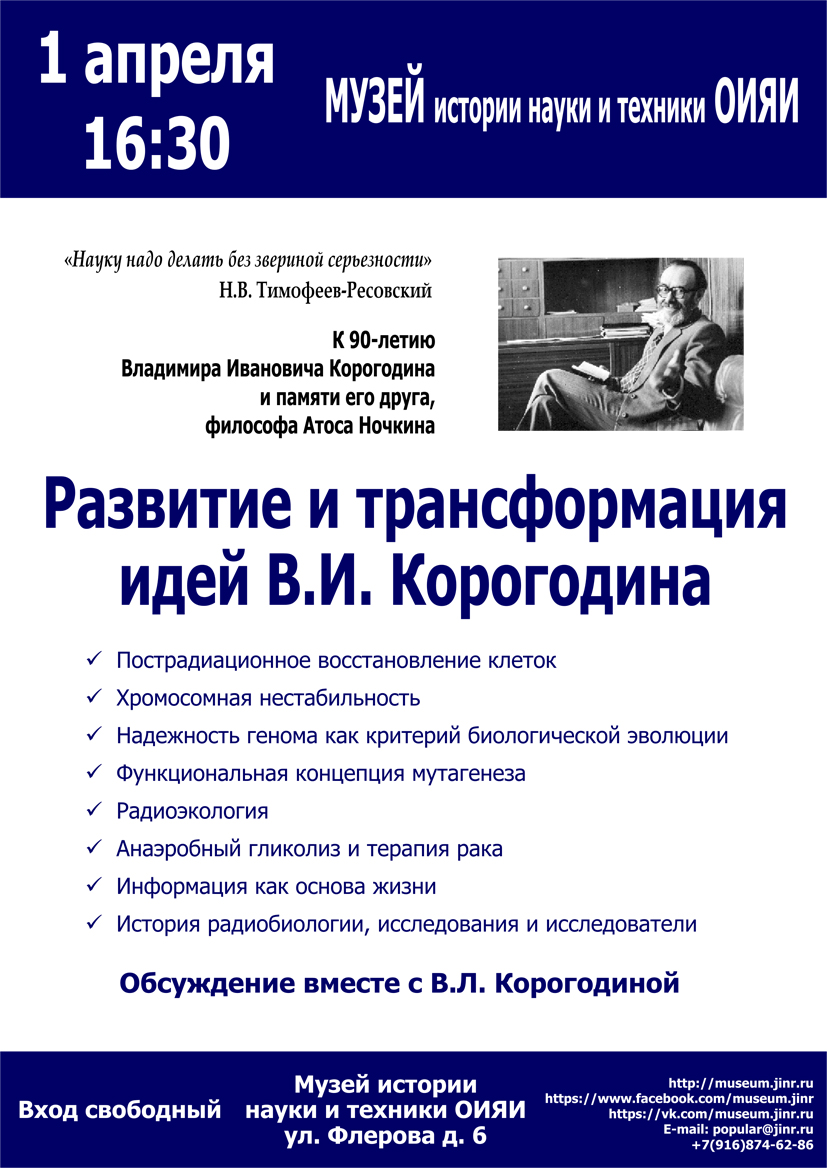 Музей истории науки и техники ОИЯИ приглашает на лекцию «Развитие и трансформация идей В.И. Корогодина», которая состоится 1 апреля 2019 года в 16:30.