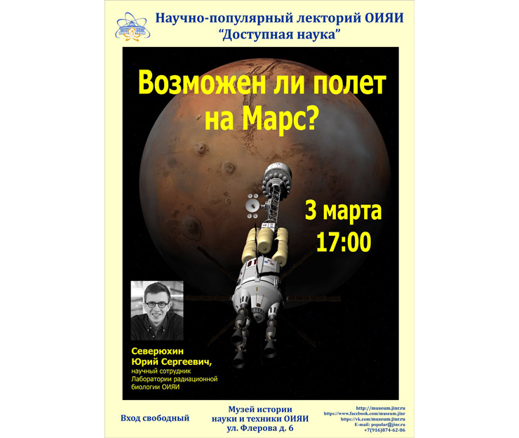 3 марта 2018 г. в 17:00 в Музее истории науки и техники ОИЯИ (ул.Флерова д.6) в рамках научно-популярного лектория «Доступная наука» состоится лекция «Возможен ли полет на Марс?».