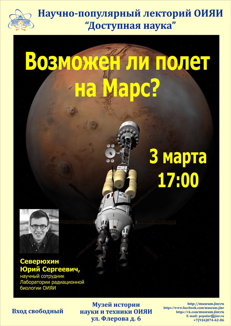 3 марта 2018 г. в 17:00 в Музее истории науки и техники ОИЯИ (ул.Флерова д.6) в рамках научно-популярного лектория «Доступная наука» состоится лекция «Возможен ли полет на Марс?».