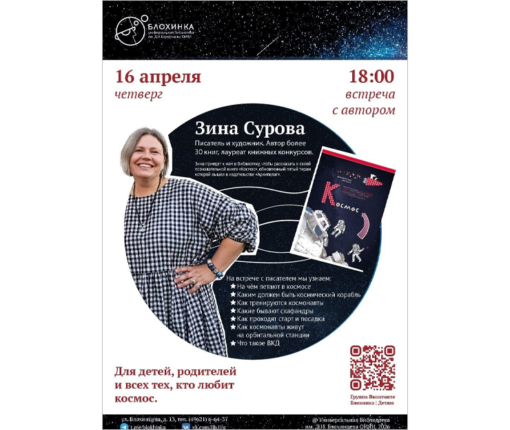 The JINR Universal Public Library invites everyone interested to the meeting with writer and artist Zina Surova, dedicated to her book “Cosmos”.