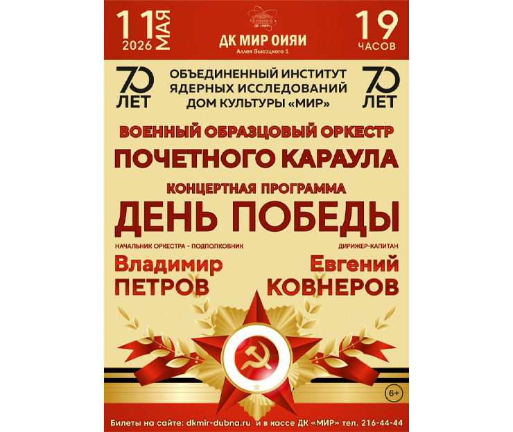 On 11 May 2026, at 5:00 PM, the JINR Mir Cultural Centre invites everyone interested to a concert of the Special Military Exemplary Band of the Honour Guard dedicated to the 70th JINR anniversary.