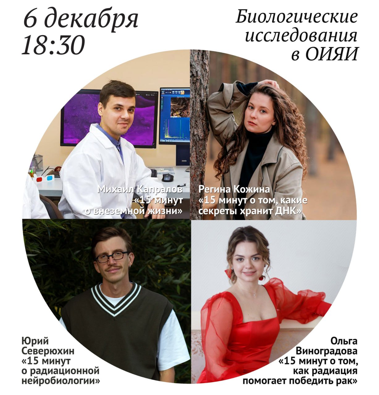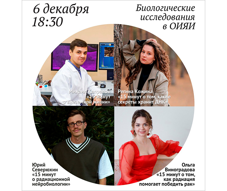 6 декабря 2024 г. в 18:30 Универсальная библиотека им. Д. И. Блохинцева ОИЯИ приглашает послушать мини-лекции о науке в формате 15×4 от ученых Лаборатории радиационной биологии ОИЯИ.