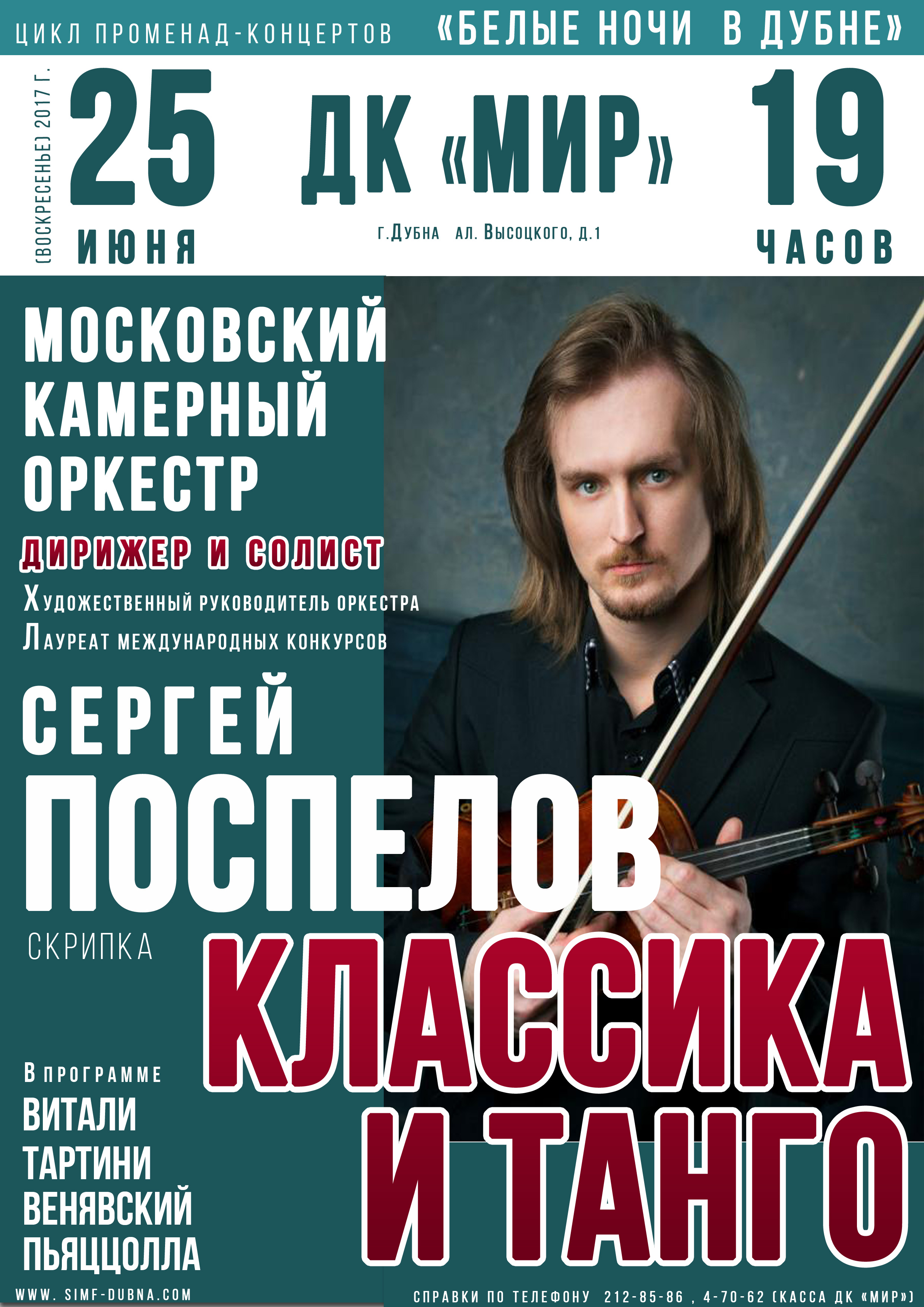 Дом культуры «Мир» ОИЯИ приглашает 25 июня 2017 г. в 19:00 на Концертконцерт – презентацию Московского камерного оркестра под управлением СЕРГЕЯ ПОСПЕЛОВА «Белые ночи в Дубне» КЛАССИКА И ТАНГО.