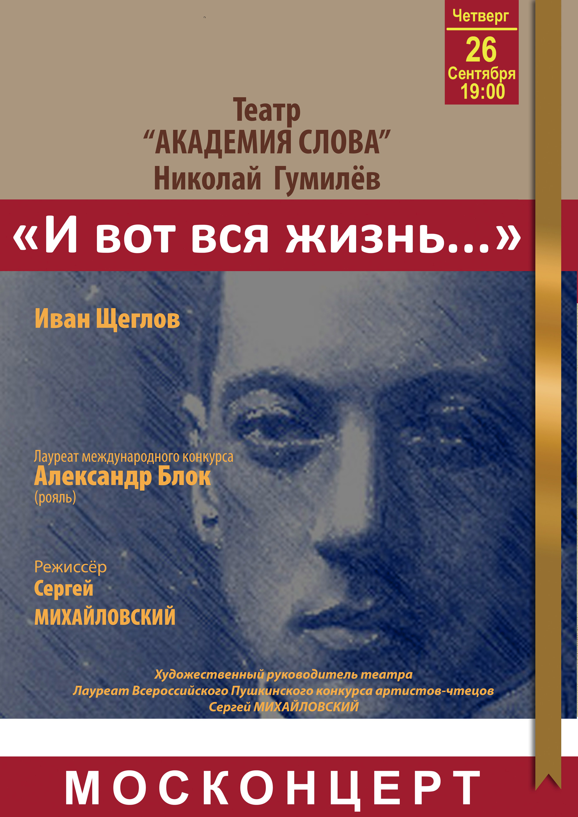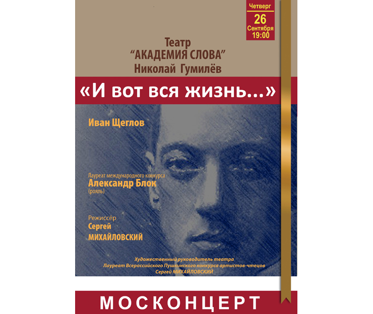 26 сентября (четверг) 2019 г. в 19:00 часов Дом ученых ОИЯИ приглашает на музыкальную постановку по произведениям Николая Гумилева «И вот вся жизнь…»
