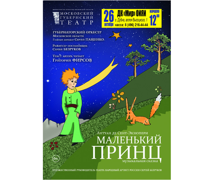 26 октября 2019 года в 12:00 часов, Московский Губернский театр приглашает в Дом культуры «Мир» ОИЯИ на музыкальную сказку «Маленький принц».