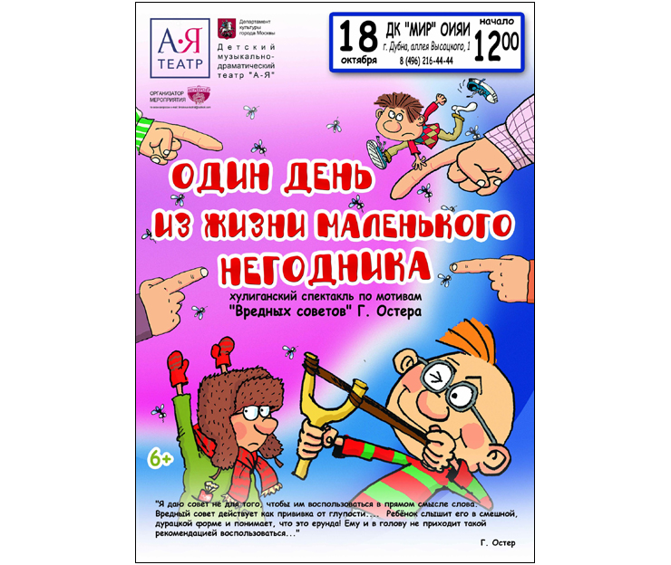 2020 г. в 12:00 часов в Дом культуры «Мир» ОИЯИ спектакль «Один день из жизни маленького негодника».