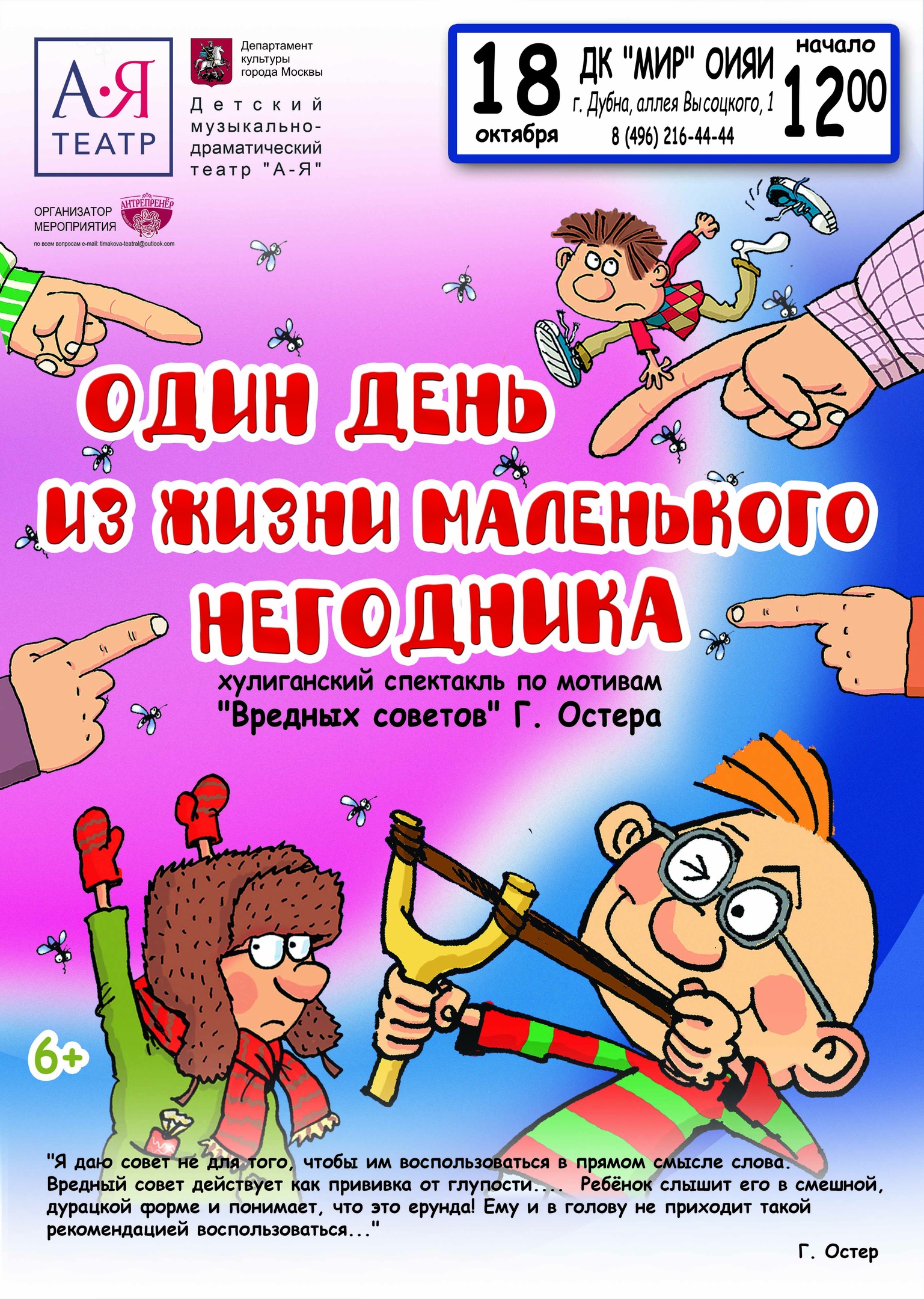 2020 г. в 12:00 часов в Дом культуры «Мир» ОИЯИ спектакль «Один день из жизни маленького негодника».