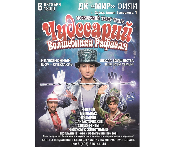 6 октября 2019 года в 13:00 часов, Дом культуры «Мир» ОИЯИ приглашает на музыкально-иллюзионный шоу-спектакль «Чудесарий» Московского театра чудес волшебника Рафаэля.