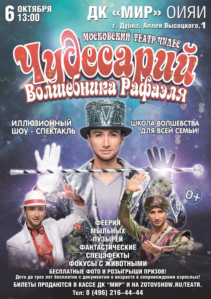 6 октября 2019 года в 13:00 часов, Дом культуры «Мир» ОИЯИ приглашает на музыкально-иллюзионный шоу-спектакль «Чудесарий» Московского театра чудес волшебника Рафаэля.