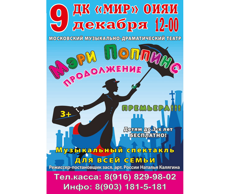 Дом культуры «Мир» ОИЯИ приглашает на Музыкальный спектакль для детей «Мэри Поппинс. Продолжение…» в постановке Московского музыкально-драматического театра. Спектакль состоится 9 декабря 2018 года в 12:00 часов.