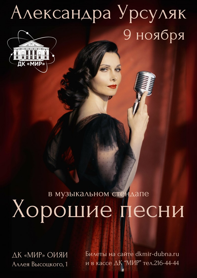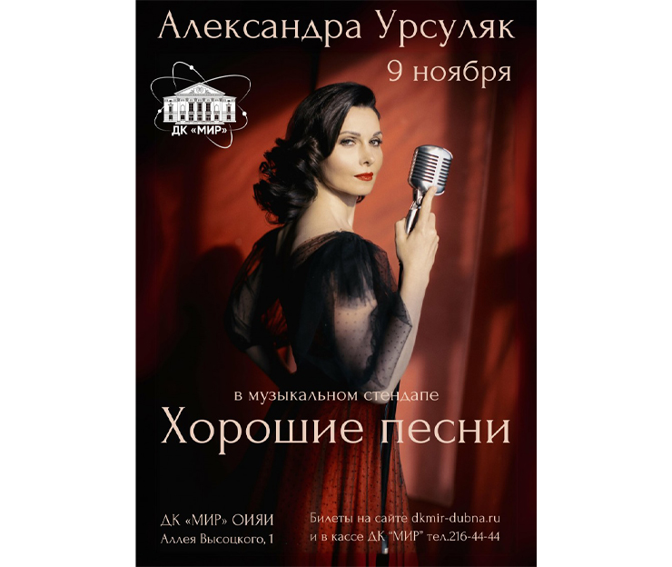 9 ноября 2024 г. в 18:00 в ДК «Мир» ОИЯИ состоится музыкальный стендап актрисы театра и кино Александры Урсуляк «Хорошие песни».