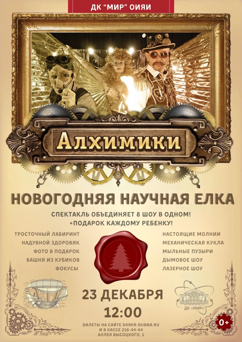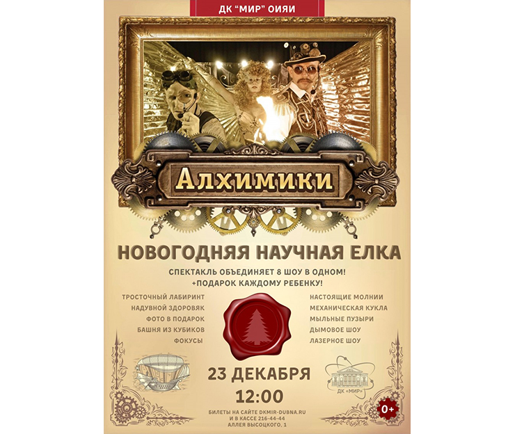 23 декабря 2023 г. Дом культуры «Мир» ОИЯИ приглашает детей любого возраста и их родителей на научную новогоднюю елку «Алхимики» от театра необычных праздников «Чудо».
