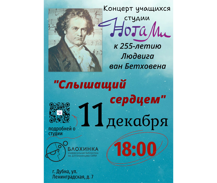 The JINR Universal Public Library invites everyone interested to the “Hearing with the heart” piano concert by the NotaMi studio dedicated to the 255th anniversary of the birth of Ludwig van Beethoven.