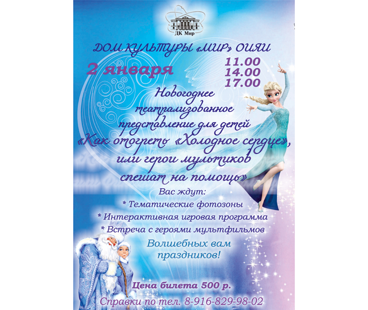 Дом культуры «Мир» ОИЯИ приглашает 2 января 2019 года на новогоднее театрализованное представление для детей «Как отогреть Холодное сердце, или герои мультиков спешат на помощь».