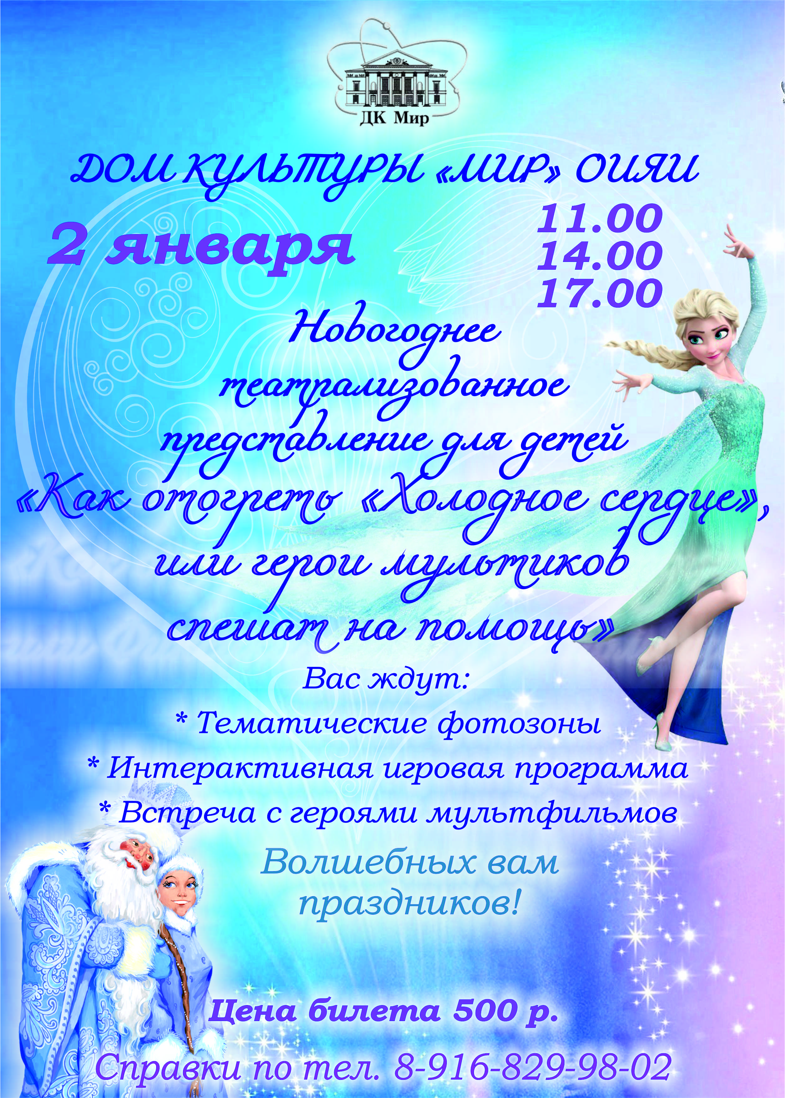 Дом культуры «Мир» ОИЯИ приглашает 2 января 2019 года на новогоднее театрализованное представление для детей «Как отогреть Холодное сердце, или герои мультиков спешат на помощь».