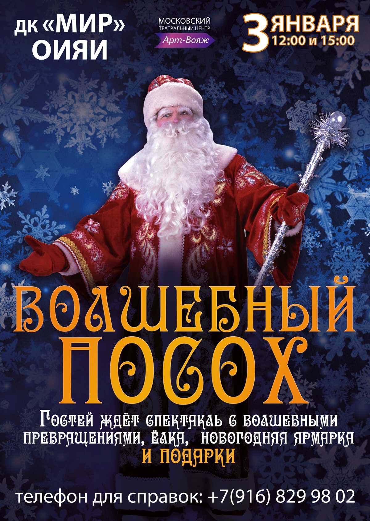 Дом культуры «Мир» ОИЯИ приглашает 3 января 2019 года на спектакль «Волшебный посох», который представит Московский театральный центр “Арт-Вояж”. Начало в 12.00 и 15.00 часов.