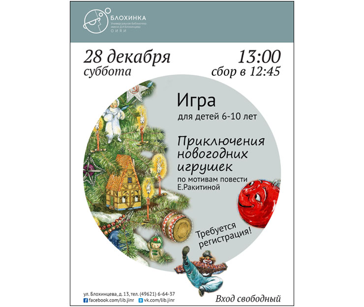 Если вы готовы отправиться на поиски, мастерить, решать головоломки, петь и танцевать, то мы зовем скорее зарегистрироваться на квест-игру для детей 6-10 лет по книге Е. Ракитиной «Приключения новогодних игрушек».