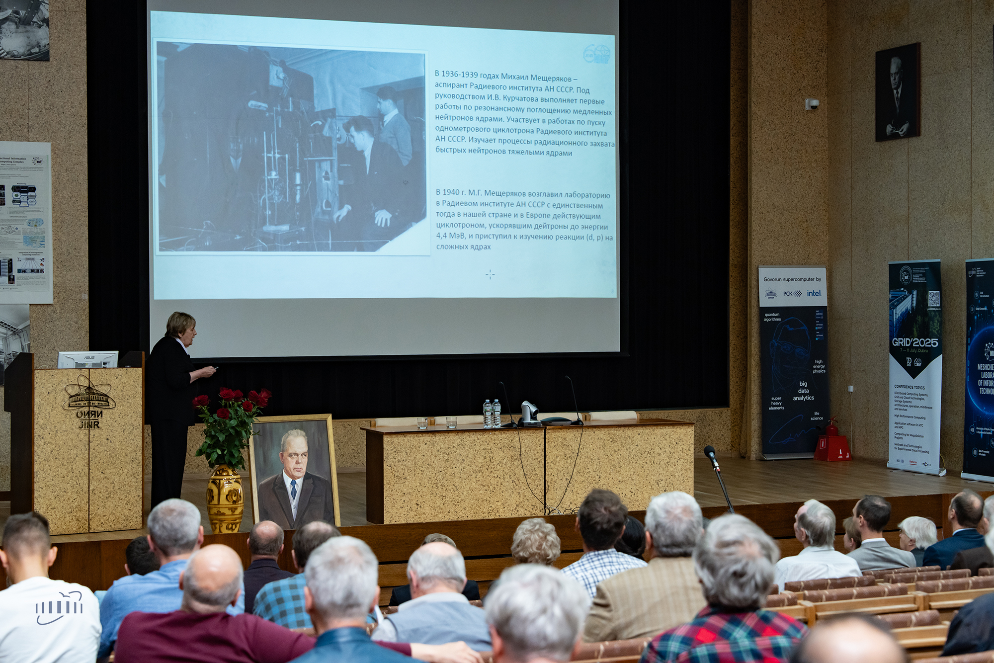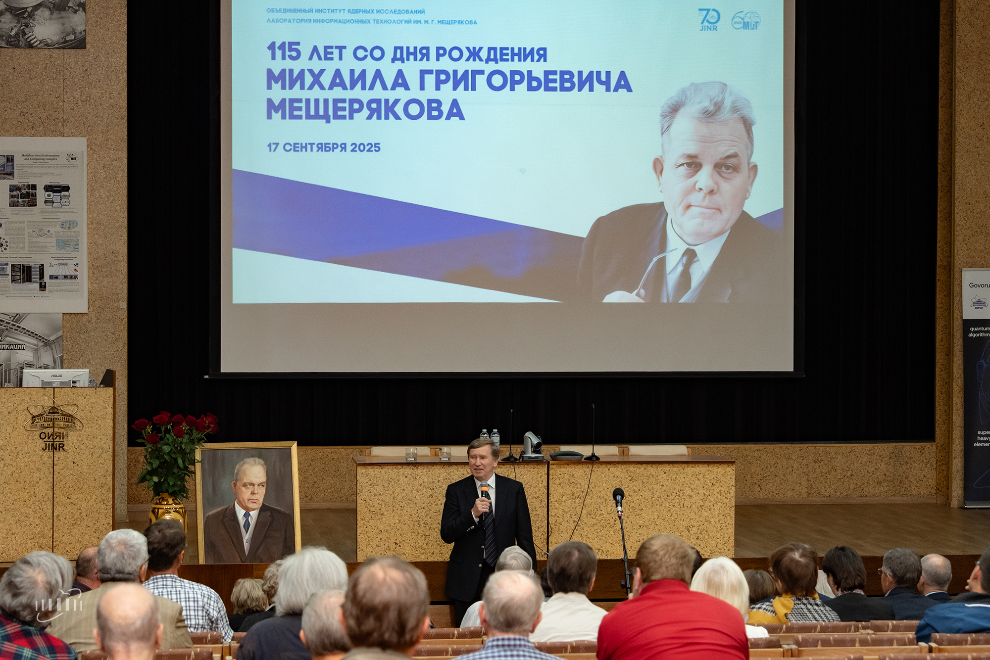 «Михаил Григорьевич Мещеряков – человек-легенда, о котором можно говорить бесконечно, ученик Курчатова, основатель города и один из создателей нашего Института. Город начинался с него, с той самой Гидротехнической лаборатории, которую ему было поручено возглавить. Перед этим он участвовал в первых ядерных испытаниях, открыл путь в Америку, сотрудничая с американскими институтами, был одним из первых энтузиастов внедрения в ОИЯИ вычислительной техники и автоматизированной обработки экспериментальных данных», — напомнил о роли и значимости фигуры ученого для ОИЯИ и Дубны вице-директор Института Владимир Кекелидзе.