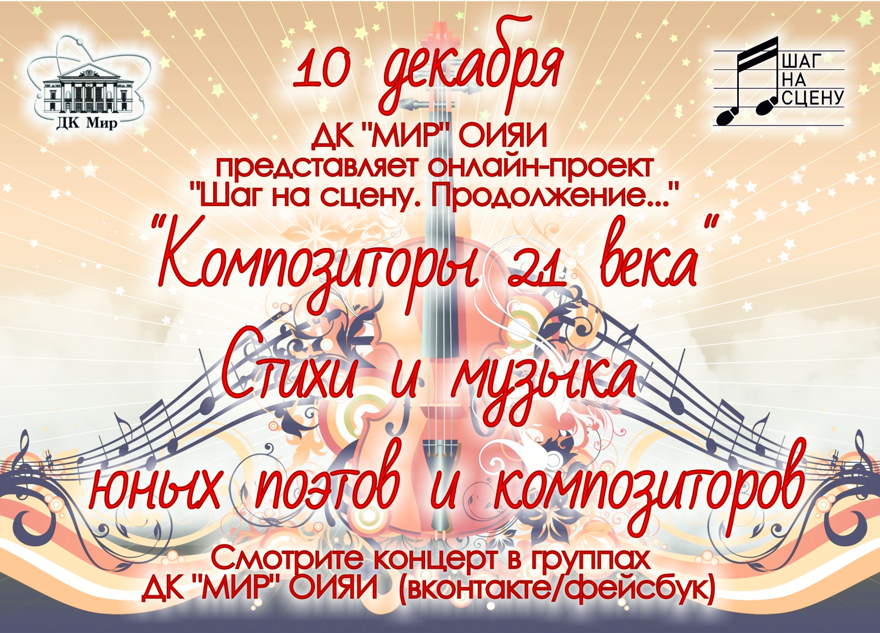 10 декабря 2020 г. Дом культуры «Мир» ОИЯИ совместно с Фондом развития искусства и поддержки талантливой молодежи «Шаг на сцену» ждут гостей в группе ВКонтакте на онлайн-концерт «Композиторы 21 века».