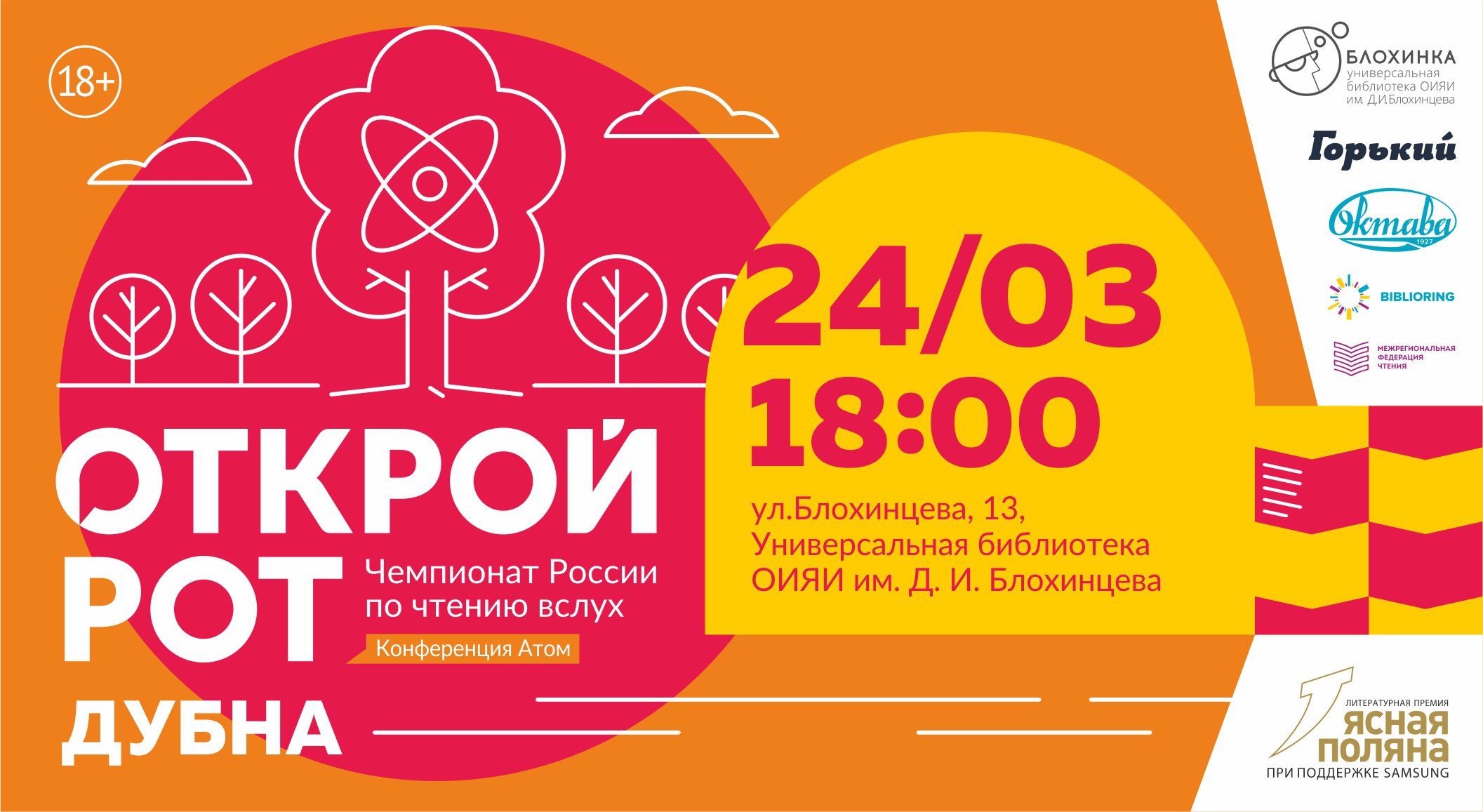 24 марта 2018 г. в 18:00 в Универсальной библиотеке ОИЯИ в третий раз в Дубне состоится отборочный тур конференции «Атом» Чемпионата России по чтению вслух «Открой Рот». Регистрация участников на сайте Чемпионата.