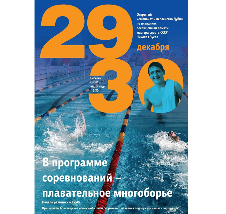 29 — 30 декабря в бассейне «Архимед» пройдет Открытый чемпионат и первенство Дубны по плаванию, посвящённый памяти мастера спорта СССР, Николая Зуева.