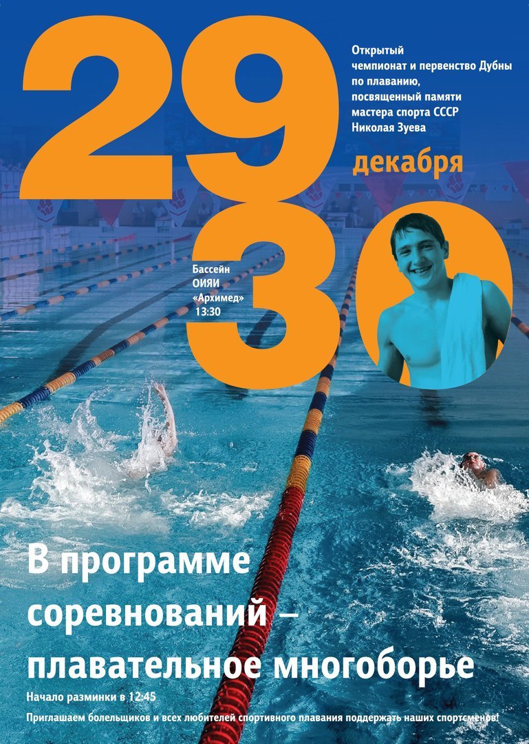 29 — 30 декабря в бассейне «Архимед» пройдет Открытый чемпионат и первенство Дубны по плаванию, посвящённый памяти мастера спорта СССР, Николая Зуева.