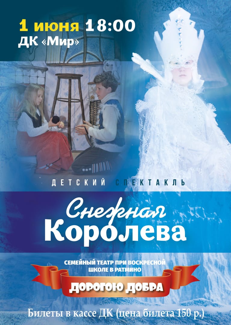 In the frames of celebrations of the International Children’s Day, the JINR Cultural Centre “Mir” invites to the “Snow Queen” play staged by “The way of goodness” family theatre (the Sunday school of the Church of Praise of the Blessed Virgin).