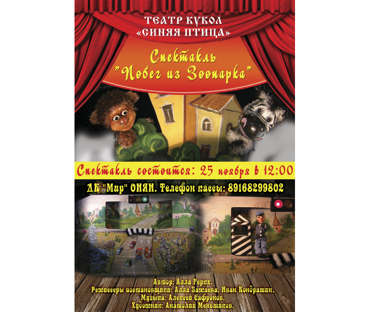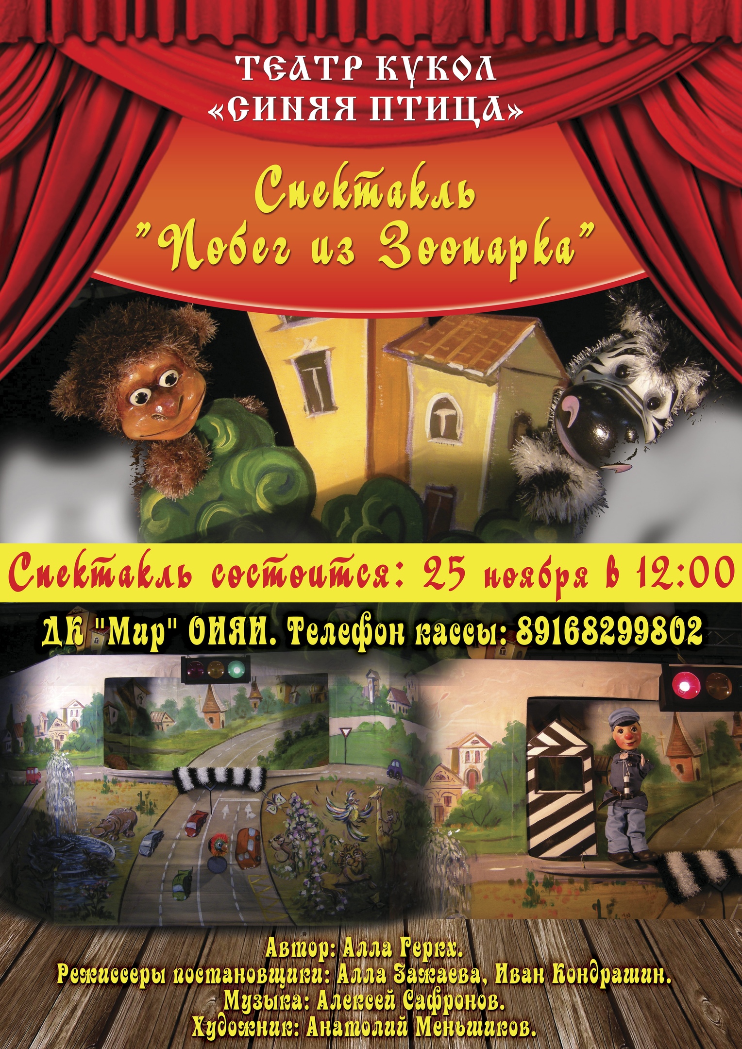 Дом культуры «Мир» ОИЯИ приглашает на спектакль «Побег из зоопарка» в исполнении кукольного театра «Синяя птица».